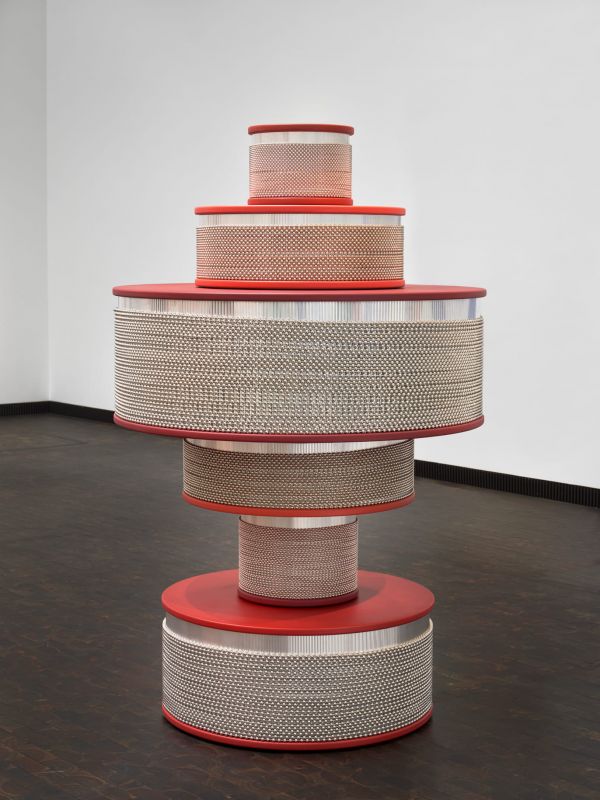 Bild: Nevin Aladağ, Cabassa Tower, 2025, Holz, Lack, Stahl, Aluminiumblech, verzinkte Kugelketten, 190,5 x 120 x 120 cm